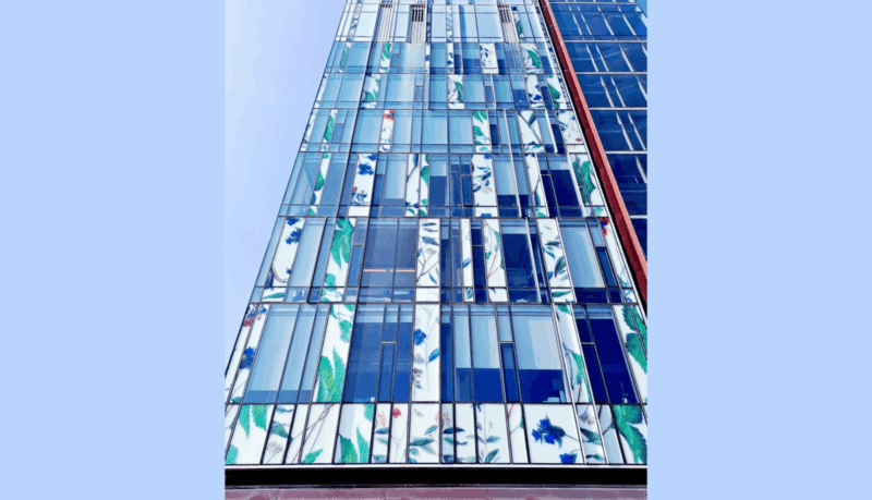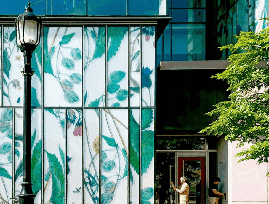 The building’s curtain walls are wrapped in 900 unique images of medicinal flowers, reflecting the role of these plants in pharmaceutical research. Canadian artist Sky Glabush reinterpreted the drawings, which were then sealed between layers of glass through a specialized process. Done poorly, it would have been an eyesore for 50 years; instead, the colours remain as vivid today as when first installed.