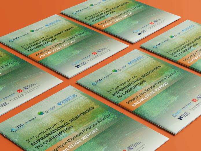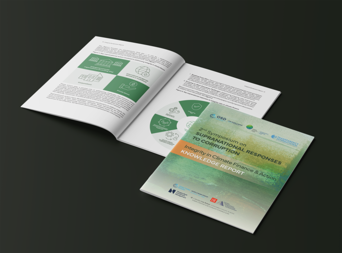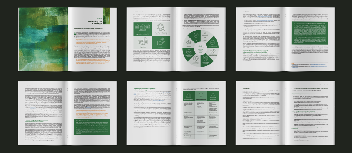 The report's design relies on a structured typesetting system to ensure readability in dense material, including citations, tables and data visualizations. Custom iconography and clean layouts improve navigation and reader engagement. The cover evolved from the existing Knowledge Report series, introducing a refreshed design with a nature-inspired palette to reflect the report's climate theme. The outcome enhances the accessibility and impact of the symposium's insights, supporting knowledge sharing and advancing global dialogue at the intersection of climate action and anti-corruption.