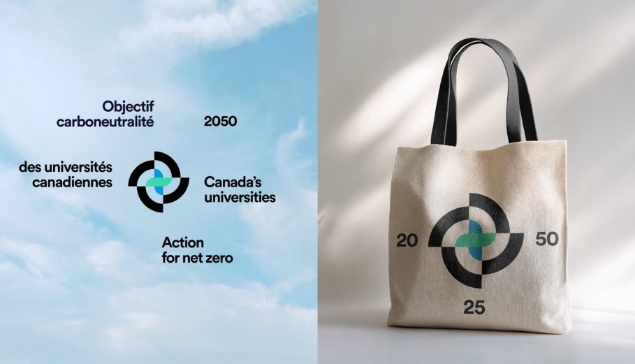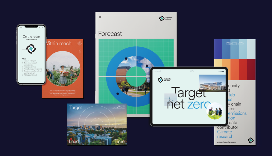 Universities Canada launched the Action for Net Zero initiative to measure and accelerate climate progress across its member institutions, requiring a visual identity capable of reflecting national leadership and mobilizing collective action. Designer Judith Lacerte RGD developed a unifying system that communicates both ambition and accountability. At the core is a distinctive logo that merges two symbolic elements: a target, representing measurable progress toward greenhouse gas reduction, and a radial form inspired by wind energy, conveying movement, adaptability and renewable power.