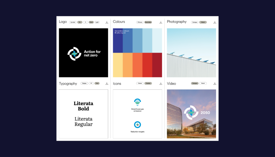 The identity was designed for versatility, extending across digital and print applications to ensure consistency and recognition across a network of institutions. To support broad adoption, a comprehensive brand toolkit was developed, including customizable templates for social media, web and print, enabling institutions to share their commitments and progress within a cohesive, flexible framework. The result provides a strong and recognizable platform for engagement, reinforcing shared purpose while allowing individual institutions to express their unique contributions.