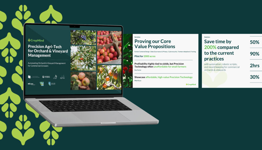 KFOBIX develops a durable nanocomposite coating that prevents icing and contamination on surfaces such as solar panels, wind turbines and vehicles. Kathleen redesigned the company’s mark to incorporate a water droplet and snowflake, highlighting the product’s ability to repel water and prevent ice formation. CropMind builds a computer-vision platform that helps fruit growers automate crop management and reduce manual labour. The visual concept for CropMind centres on the convergence of technology and agriculture, with an icon that merges a brain and seed form to symbolize intelligent crop management, with three green variations representing growth across the crop lifecycle.