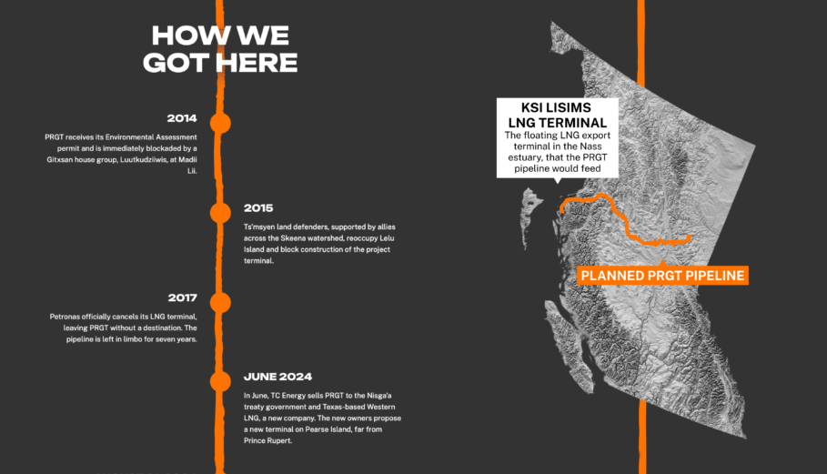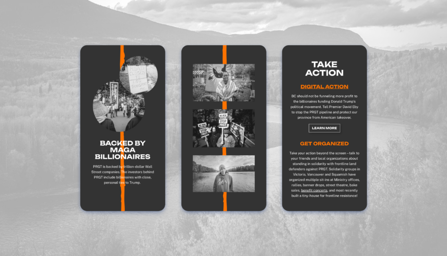 For over a decade, the proposed Prince Rupert Gas Transmission pipeline (PRGT) has threatened Indigenous lands and ecosystems across northern BC. In mid-2024, the campaign reached a critical point when the provincial government ruled that PRGT had been “substantially started,” allowing it to bypass a new environmental assessment. Climate Action Network Canada approached Significant Other with an urgent brief: create a digital platform capable of explaining a decade of legal, political and environmental context while supporting a coalition of Indigenous land defenders and allied organizations.