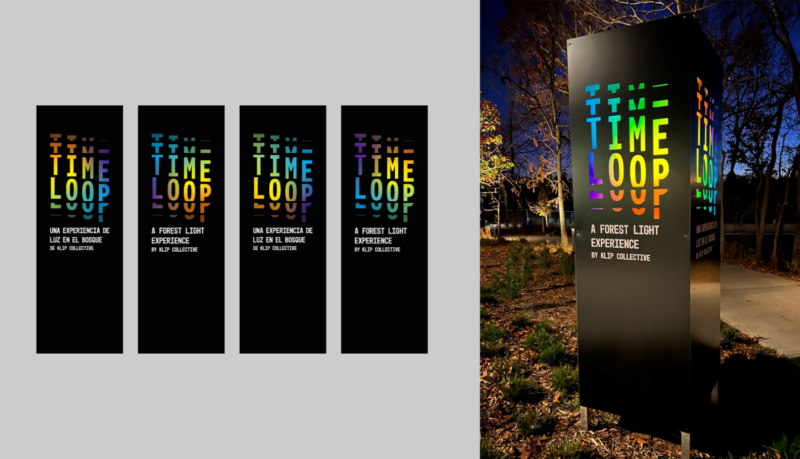 Time Loop is a nighttime art experience in the North Forest of Crystal Bridges Museum of American Art, immersing visitors in light, sound and projection mapping to explore themes of time, space and wonder. Crystal Bridges asked for a graphic system to support the exhibit, its marketing and gift shop merchandise, starting with a logo that could be as striking in black and white as in full colour.