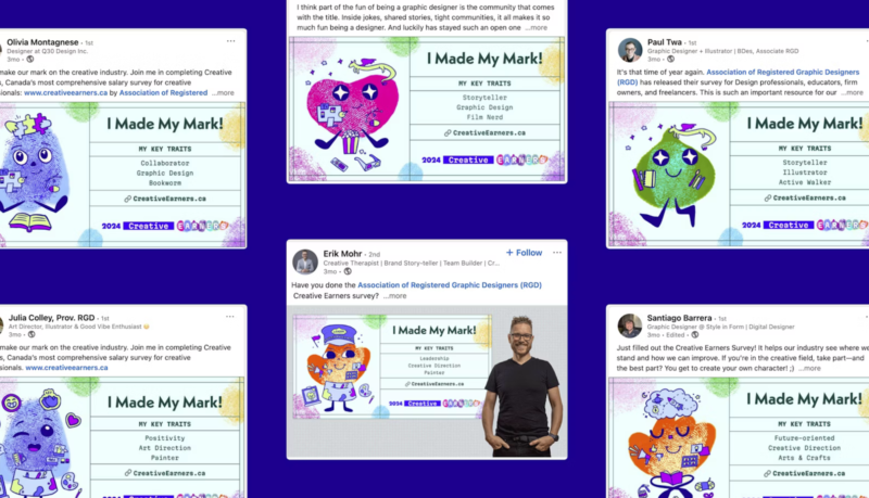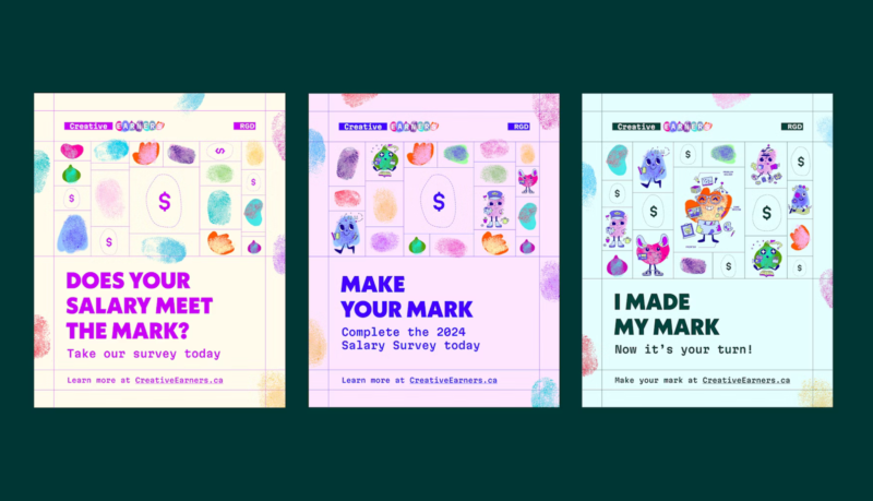 The RGD’s Creative Earners salary survey is an initiative that collects, analyzes and reports on career data from professionals across the Canadian creative industry. With a national audience spanning all career stages and disciplines, the project needed to communicate the value of the data while encouraging survey participation through a creative, engaging experience. Creative Currency’s design direction coalesced around the theme of “Leave Your Mark”—a nod to self-expression, transparency and identity. The resulting creative concept revolved around customizable thumbprint characters—each one a playful symbol of the unique individuals that make up our industry. These characters could be personalized through an interactive builder that let participants mix professional roles (e.g., UX designer, art director) with fun traits (e.g., caffeinated, nocturnal, plant parent).
