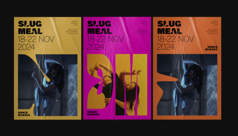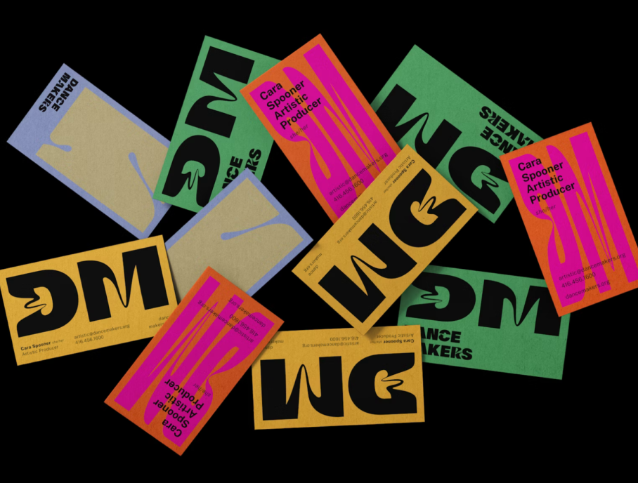 Co-Effect partnered with Dancemakers to guide this transformation. Through engagement with artists, board members and community stakeholders, the team shaped a brand that embodies energy, movement and plurality. Letterforms stretch and warp in a custom typographic system, reflecting transformation, while a vibrant colour palette draws on grassroots arts communities. Flexible templates ensure the identity works across performances, curatorial projects and digital or print platforms.