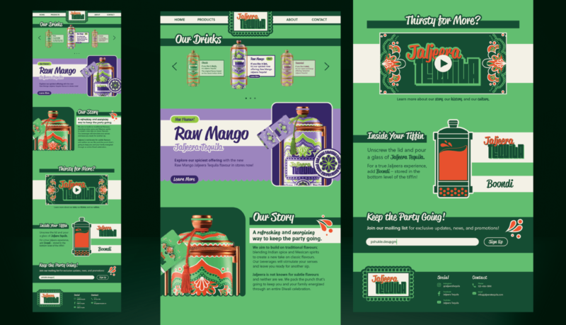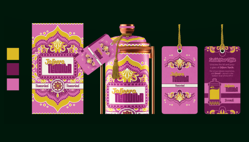 Jaljeera Tequila is a conceptual brand that was designed to bring culturally rooted adult beverages into Indian-Canadian party spaces while matching the energy and vibrancy of cultural celebrations. The brand was created in response to a branding project at Alberta University of the Arts, where students were asked to resolve a new name and product from scratch in the beer, wine or spirits category and create labelling, packaging and a distinguishable brand presence for three offerings.