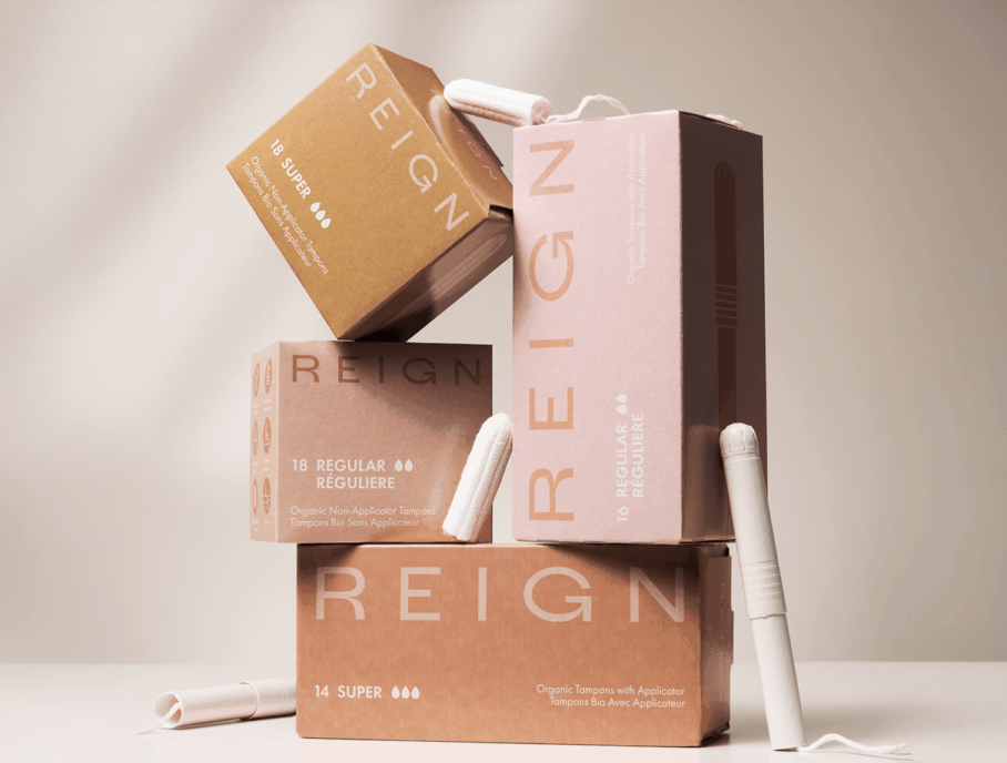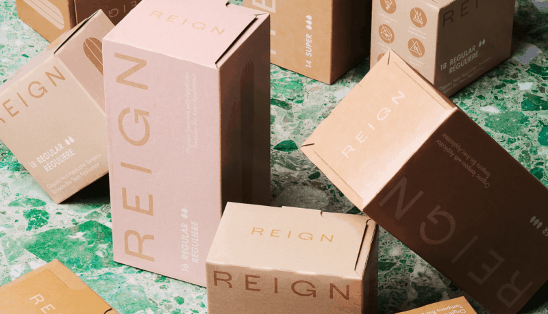 A restrained, earth-toned palette, uncoated paper wrappers and boxes and a clear hierarchy create shelf legibility, while concise educational copy demystifies ingredients and sustainability. The result is a distinctive, trustworthy system that rejects sterile and hyper-feminine cues, improves readability at a glance and provides a flexible platform for future SKUs and content—positioning Reign as a modern standard for safer, plastic-free period care. Reign is now in 80+ retail locations—including Costco and London Drugs—reinforcing market fit and visibility.