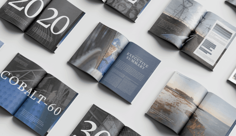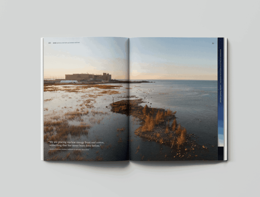 This publication illustrates the unprecedented challenges the company faced during 2020 from the COVID-19 global health crisis and how they turned its innovative firepower into initiatives to help their local community. The report’s format draws attention to Bruce Power’s work with local residents, businesses, volunteers and companies. Work with the printer provided interesting solutions for finishes such as foil stamping, blind debossing, high build spot UV varnish and Smyth binding with exposed blue threads, in keeping with overall branding. The text is broken up into index cut signature steps and blocked into the three important areas: COVID-19 initiatives, company operations and the future of electricity. The publication was mailed out to staff working from home, business owners and community members to become a resource on how Bruce Power is responding to the pandemic at work, in their local communities and the province.