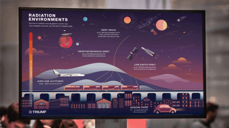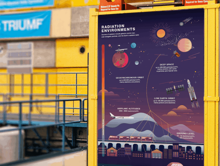 To capture the significance of triumf’s operational capacity in a visually engaging and easy-to-understand information graphic, the design needed to incorporate intricate, highly technical information in a clear and concise way. Operating a cluster of radiation testing facilities under the label “PIF & NIF” (for Proton Irradiation Facilities and Neutron Irradiation Facilities), triumf serves commercial clients such as aerospace firms, satellite companies, automotive manufacturers, and electronic parts manufacturers. Working closely with PIF & NIF researchers, the illustrator and art director established a clear format prioritizing the brand and the usability of the final asset. The final deliverable was produced for a large print display over the triumf Tour Route and used for STEM outreach efforts. Digital versions were also created for use online and in screen displays and presentations. The asset’s availability in different formats has helped PIF & NIF promote their services and recruit collaborators.